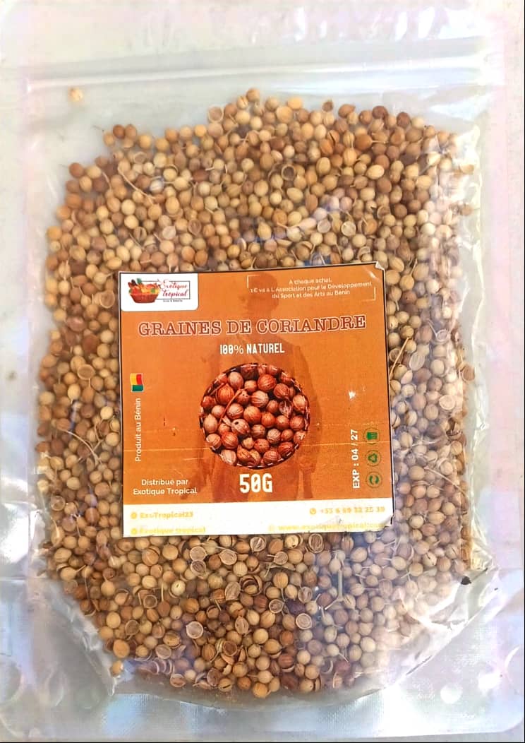 Les graines de coriandre (Coriandrum sativum), cultivées dans les régions tropicales ensoleillées, offrent un arôme doux, chaud et légèrement citronné qui sublime viandes, poissons, légumes, sauces et ragoûts. Elles sont également reconnues pour leurs vertus digestives, antioxydantes et anti-inflammatoires, contribuant au bien-être quotidien. Chez Exotique Tropical, nos graines de coriandre sont pures, fraîches et de haute qualité, pour des plats savoureux et naturellement bénéfiques.